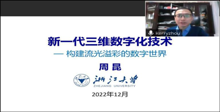 2022年12月1日上午,浙江大学计算机学院教授、国际计算机学会会士(ACM Fellow)、国际电气与电子工程师协会会士(IEEE Fellow)周昆教授 “动漫画 智能科学前沿论坛”带来了一场精彩的报告,报告题目为“新一代三维数字化技术——构建流光溢彩的数字世界”,报告采用线上形式,吸引了包括动漫画 、人工智能研究院、王选计算机研究所和计算机学院等众多老师和同学的参与。