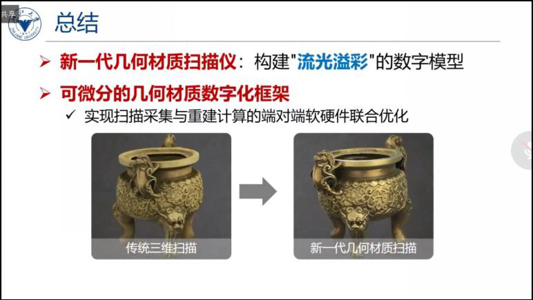 接下来,周昆教授介绍了三维物体的数字化表示和从真实世界重建三维数字物体的研究进展。三维物体的数字化表示包括对几何形状和外观材质的表示,其中外观材质作为一个随空间、光照和视角变化的高维函数,刻画了物体表面的“流光溢彩”。随后,周教授介绍了目前的三维数字化技术与系统现状,总结了目前三维扫描仪和材质扫描仪的特点和存在的问题,阐释了联合采集复杂物体的几何与材质所面临的难点,并提到数据采集与重建计算应进行联合优化。