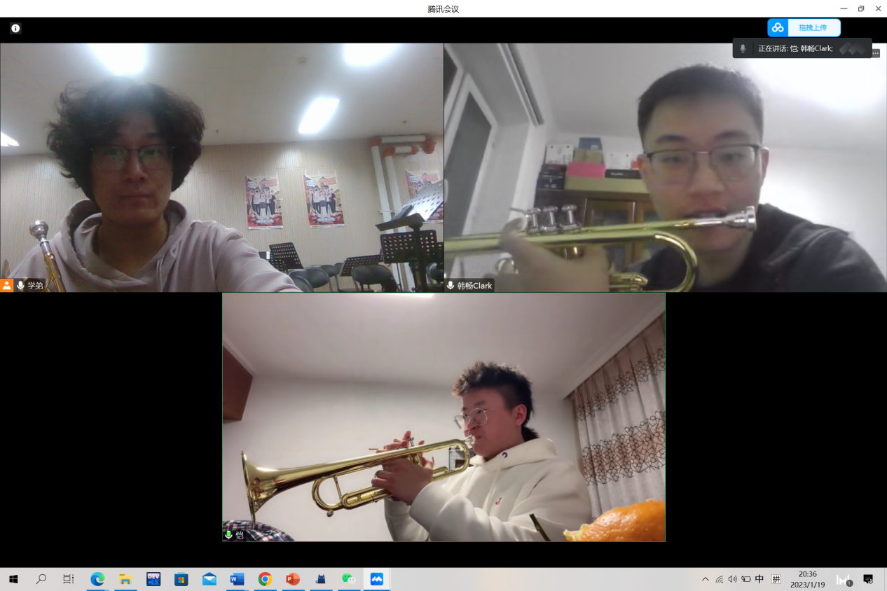 “圆号声部的两位都是第一次接触这个乐器,实际上在刚开始教学时我也有些不知所措。回忆着自己入门时的感受和遇到过的困难,我尽力将自己的经验和体验传递给他们,并在布置的作业和第二次上课中感受到了声部成员们练习的用心。圆号不论入门还是提升都是很有难度的乐器,而成员们进步之快令我十分惊喜。一边感受着乐队同学对于音乐的热爱,一边回想着十余年来学习圆号的点滴,每周与声部成员们共同享受音乐的时光实为难得的经历。”
