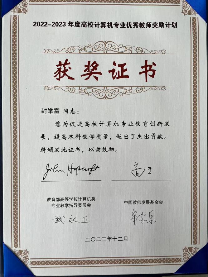 封举富教授2022—2023学年度高校计算机专业优秀教师奖励计划获奖证书