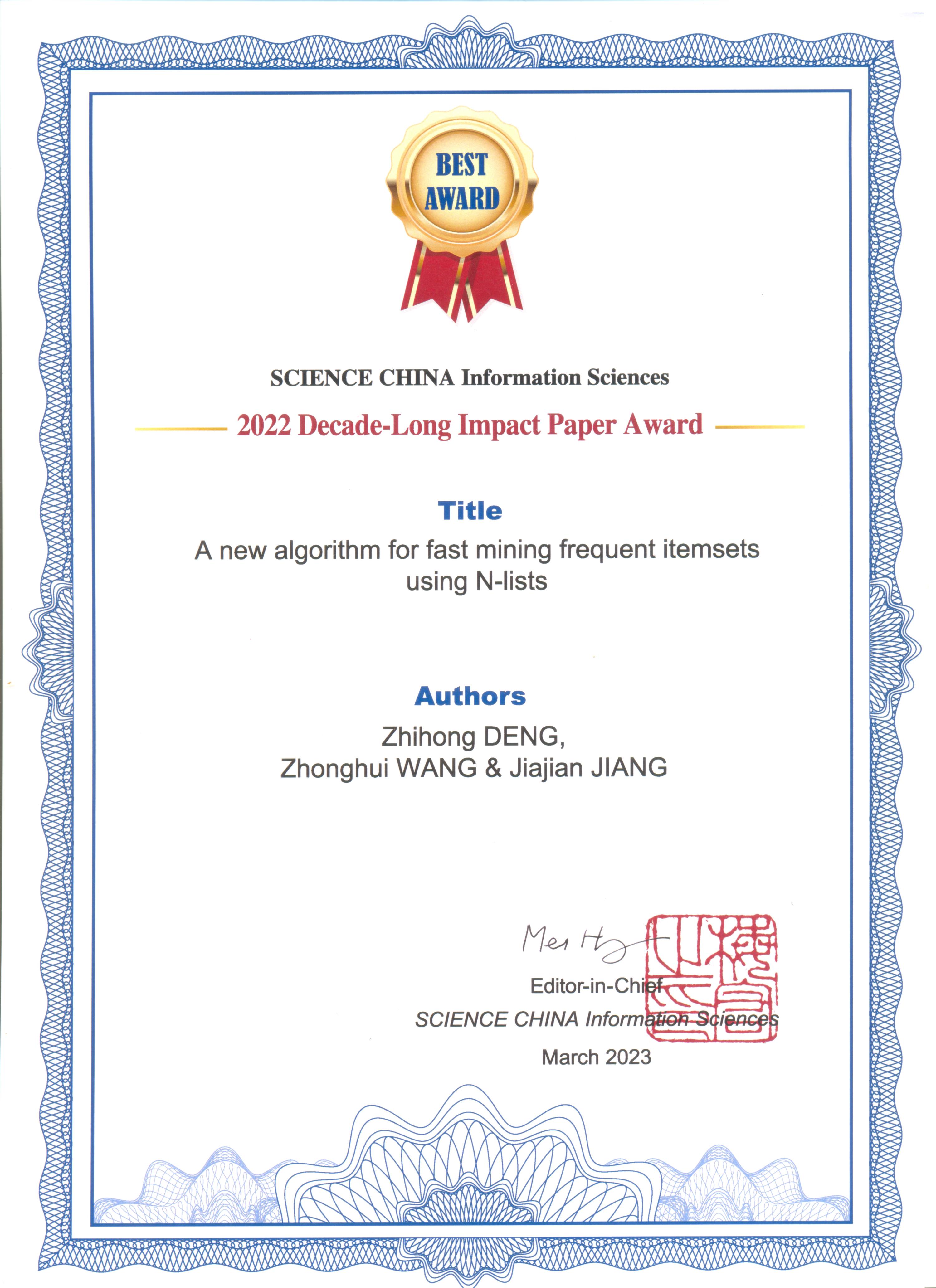 以邓志鸿教授为第一作者及通讯作者的论文“A New Algorithm for Fast Mining Frequent Itemsets Using N-Lists”获评2022年度《SCIENCE CHINA Information Science》十年经典论文奖。该论文发表于《SCIENCE CHINA Information Science》2012年第55卷第9期,曾获评2017年度《SCIENCE CHINA Information Science》五年持续影响力论文奖。这篇论文提出了一种名为N-Lists的新颖数据结构。N-Lists能够在尽量压缩数据的前提下完整保留数据的统计信息。基于N-Lists,论文又提出了线性复杂度的项集模式计数算法,极大地提高了计算效率。论文发布后,N-List及计数算法得到国内外同行的持续关注和广泛使用,成为国际模式挖掘领域代表性工作之一。