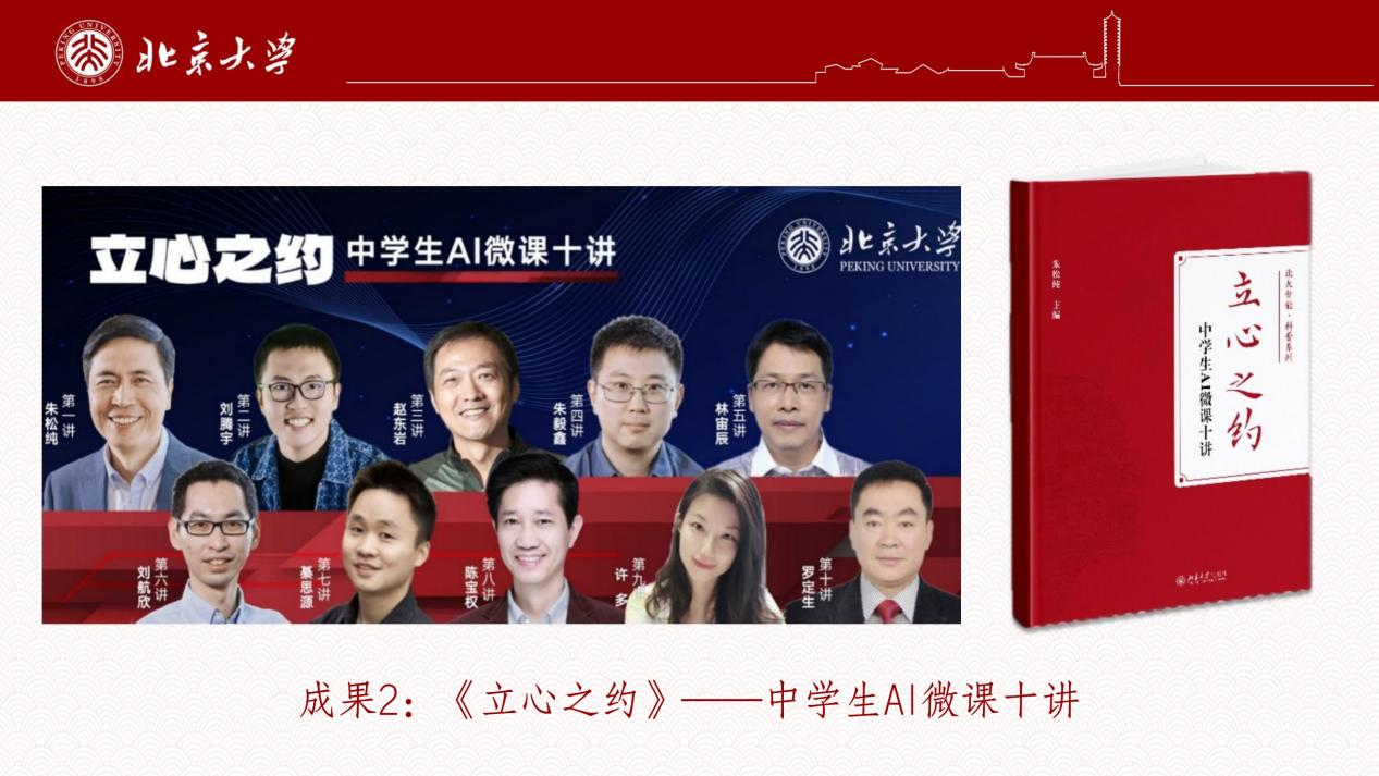、北京通用人工智能研究院联合发布“《立心之约》微课十讲”,20余位专家组成教学团队,浓缩凝练北大人工智能本硕博课程体系30余门核心课程,推出全国首套面向中小学生的公开视频课程,面向中小学生发出“立心”邀约。课程自2023年首播即突破千万观看量,次年入选教育部“名师教AI”专栏。2025年,这门备受瞩目的视频课程以图书形式出版。
