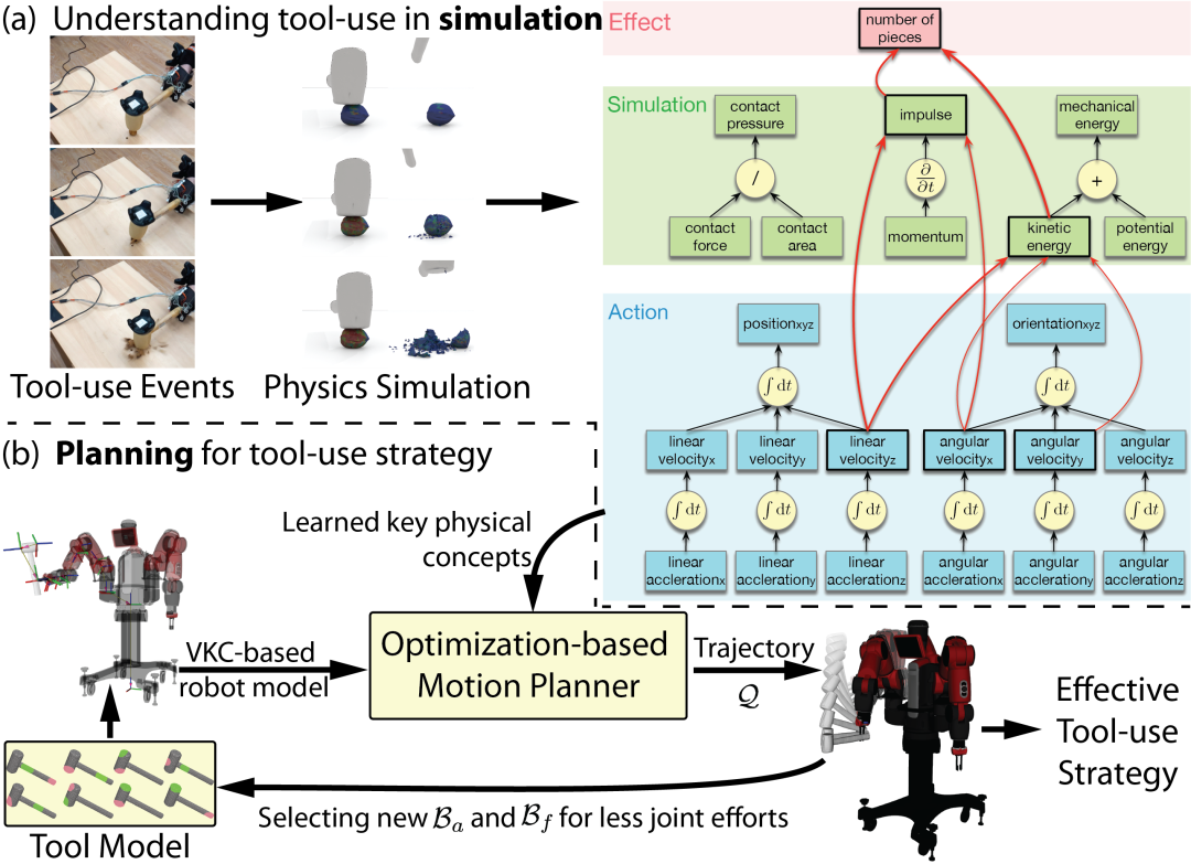 在这项工作中,研究人员证明了所提出的学习和规划框架能够识别对任务成功有重要意义的基本物理量,自主规划有效的工具使用策略,模仿人类使用工具的基本特性。同时该方法能将见过的和未见过的物体作为工具,根据机器人自身机构以最省力的方式来使用。该论文所提出的框架使得机器人通过利用高精度物理仿真环境更好地理解物理常识,并在遇到新的(即未见过的)工具时,能够更好的规划工具使用策略。