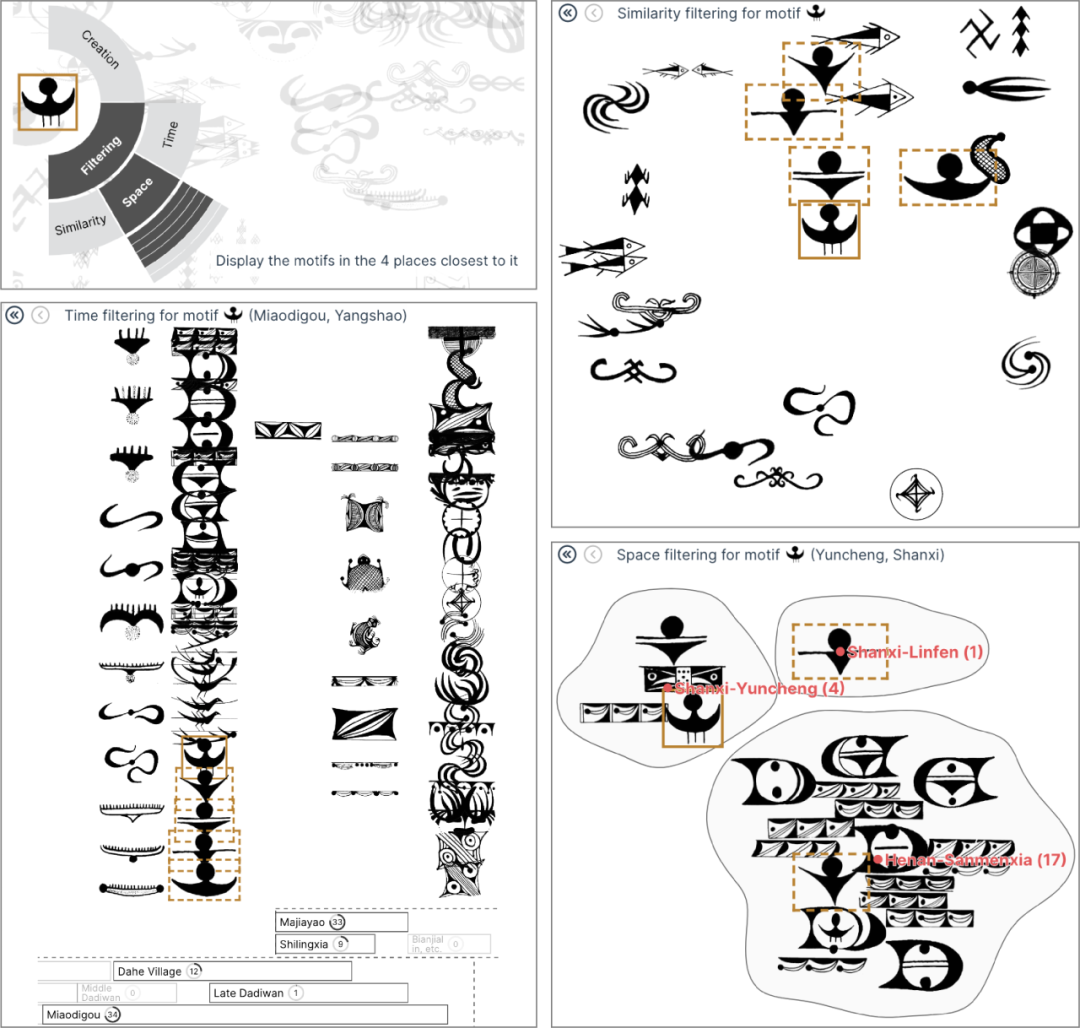 花纹演变分析仍是一项具有挑战性的任务,尤其是在花纹选择方面。作为艺术创作,花纹在外观上拥有很大的自由度。某些主题的花纹变化可能过于剧烈而难以识别。如果没有适当的策略,选择过程会费时费力。此外,相似或相同主题的花纹不一定具有演变关系。受当时生产力水平限制,花纹在长时间或远距离产生持久影响的可能性较小。引入时空约束会进一步增加选择复杂性。另一方面,记录演变的方法也存在诸多不便。目前演变仅以文字形式呈现,与花纹图像并列,导致考古学家在记录过程中不得不经常转移焦点。缺乏多样化的注释选项(例如突出图案的特定部分)也降低了记录过程的有效性。