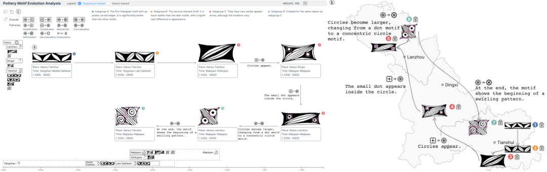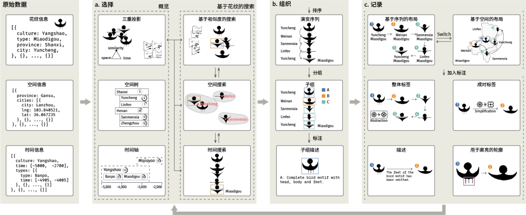 课题组提出可视分析系统PM-Vis。PM-Vis整合花纹时间、空间和外观特征,通过“选择-组织-记录”工作流程提供对花纹演变分析的全过程支持。如图2所示,在选择阶段,三重投影显示花纹的外观相似性和时空接近性。用户可以全局或根据特定花纹切换布局,以识别具有演变联系的花纹。组织阶段帮助建立演变序列,并根据花纹的变化程度将其划分为更有组织的子组。最后,记录阶段为这些花纹提供更具针对性的可视化,并支持考古学家通过多种形式的原位注释记录观察结果和见解。