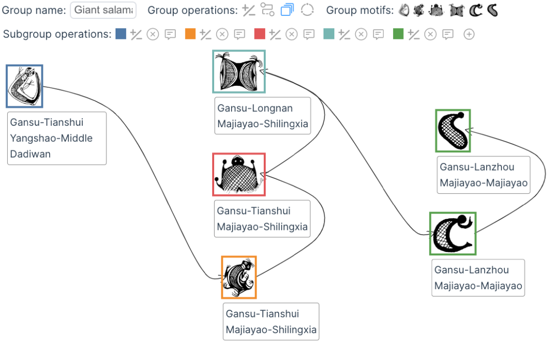 组织阶段帮助用户在搜索完成后确定这些花纹的演变序列和演变分组(图5)。在该阶段,界面只展示选中的花纹,并且花纹的水平方向表示时间,竖直方向表示外观相似度。在序列创建模式下,用户依次点击两个在演变上相邻的花纹对,即可构建指示演变方向的线段。在分组模式下,用户可以创建、修改、删除子组以及加入注释。
