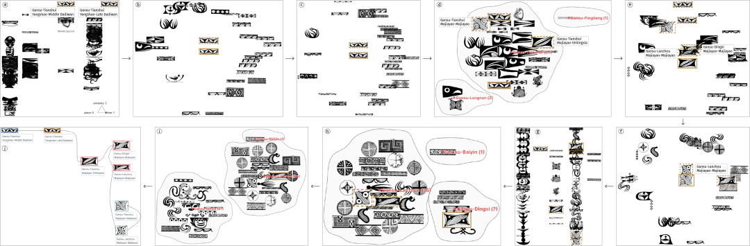 在案例分析中,考古学家探索了最早出现在仰韶文化中的相向弧边三角纹。花纹选择和组织过程见图7。最初,考古学家将三重投影的时间权重设置为1,在仰韶文化中发现了两个三角纹(图7a)。随后,他对这些花纹进行了相似性和空间搜索,发现了另外两个三角纹(图7b至d)。迭代式地进行相似性搜索又发现了三个新花纹(图7e至g)。由于基于这三个花纹的后续搜索没有新的发现(图7h和i),考古学家结束了花纹选择。随后,考古学家构建演变序列,并将花纹划分为四个子组(图7j)。最后,他通过记录界面总结发现(图6)。