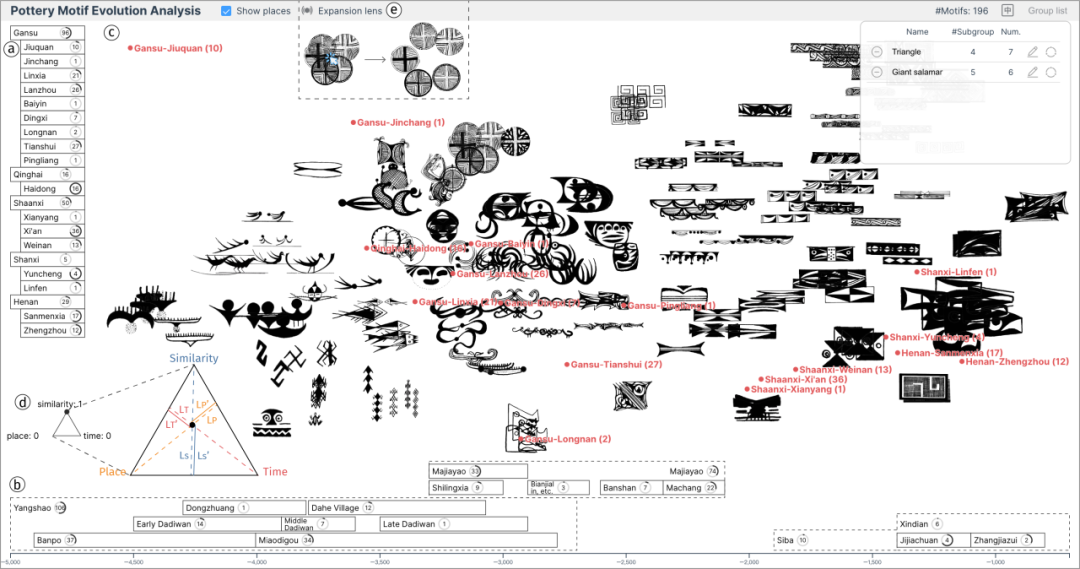 选择阶段根据外观、空间和时间帮助用户识别具有演变联系的花纹。首先,系统提供花纹概览(图3),帮助用户选择一个或多个感兴趣的花纹。概览中的空间树(图3a)和时间线(图3b)分别用于展示花纹的高层次空间和时空分布。三重投影(图3c)用于展示具体的花纹关系,包括外观相似度、时间和空间接近性。用户可以通过调整三角控件(图3d)内部锚点的位置来控制外观、时间和空间关系的权重。当花纹之间存在重叠时,用户可以通过扩散透镜(图3e)来缓解视觉混乱。当对某个特定花纹感兴趣时,用户可以通过点击的方式激活饼状菜单(图4a),然后直接创建花纹组。后续针对该组的花纹添加和移除都可以通过双击对应花纹来完成。