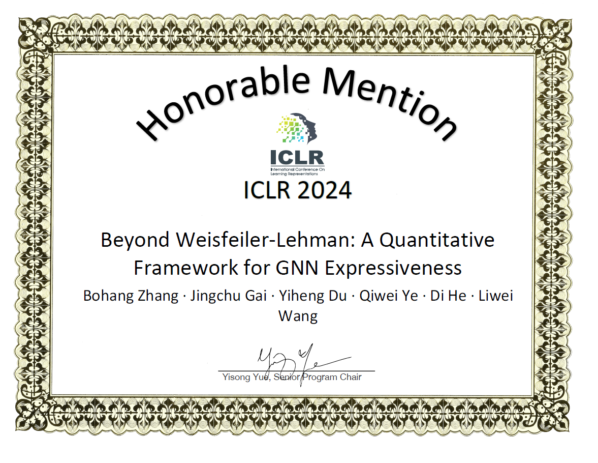 王立威、贺笛教授团队的科研成果“Beyond Weisfeiler-Lehman: A Quantitative Framework for GNN Expressiveness”经层层选拔最终荣获杰出论文奖提名,成为11篇荣获杰出论文奖提名的论文之一。该论文的共同第一作者是2019级动漫画
