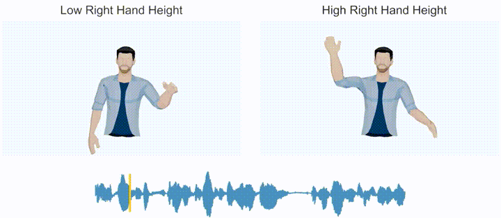 从手势生成结果来看,该系统主要有如下特性:(1)韵律感知。能够根据输入语音的节奏生成合拍的手势动作,甚至对于音乐等非语音的输入也能地捕捉其节奏,并随之“摆动”;(2)语义感知。当输入语言包含强语义词(比如me、many以及no等)时,能生成符合含义的语义手势;(3)风格编辑。能够通过加入控制信号,控制生成手势的风格(比如手高度、手势速度以及双手半径等)。