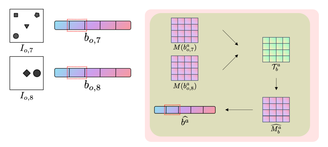 随后的符号过程使用代数理论去解答隐藏的关系。首先,符号系统利用皮亚诺公理将对单张图片的理解转化为高阶矩阵空间中的点。这些高维空间的点有助于我们将原本离散的代数运算符转化为矩阵空间中的变换。我们利用表示理论和代数系统的封闭性,将解析代数运算的问题转变为代数系统上的优化问题。选取最简单的线性优化问题来建模代数关系,不仅有解析解,且具有良好的可解释性。我们用每个题目中的题干部分分析隐藏关系,然后将分析所得的隐藏关系作用到题干中的缺失部分以预测可能的结果,再将预测的结果与选项做比较,获得最终的答案。由于我们的代数推理系统并不依赖于每个具体的运算符,而是可以在推理的过程中归纳新的运算符,因此我们称我们的方法是半符号的。