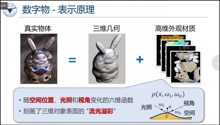 接下来,周昆教授介绍了三维物体的数字化表示和从真实世界重建三维数字物体的研究进展。三维物体的数字化表示包括对几何形状和外观材质的表示,其中外观材质作为一个随空间、光照和视角变化的高维函数,刻画了物体表面的“流光溢彩”。随后,周教授介绍了目前的三维数字化技术与系统现状,总结了目前三维扫描仪和材质扫描仪的特点和存在的问题,阐释了联合采集复杂物体的几何与材质所面临的难点,并提到数据采集与重建计算应进行联合优化。