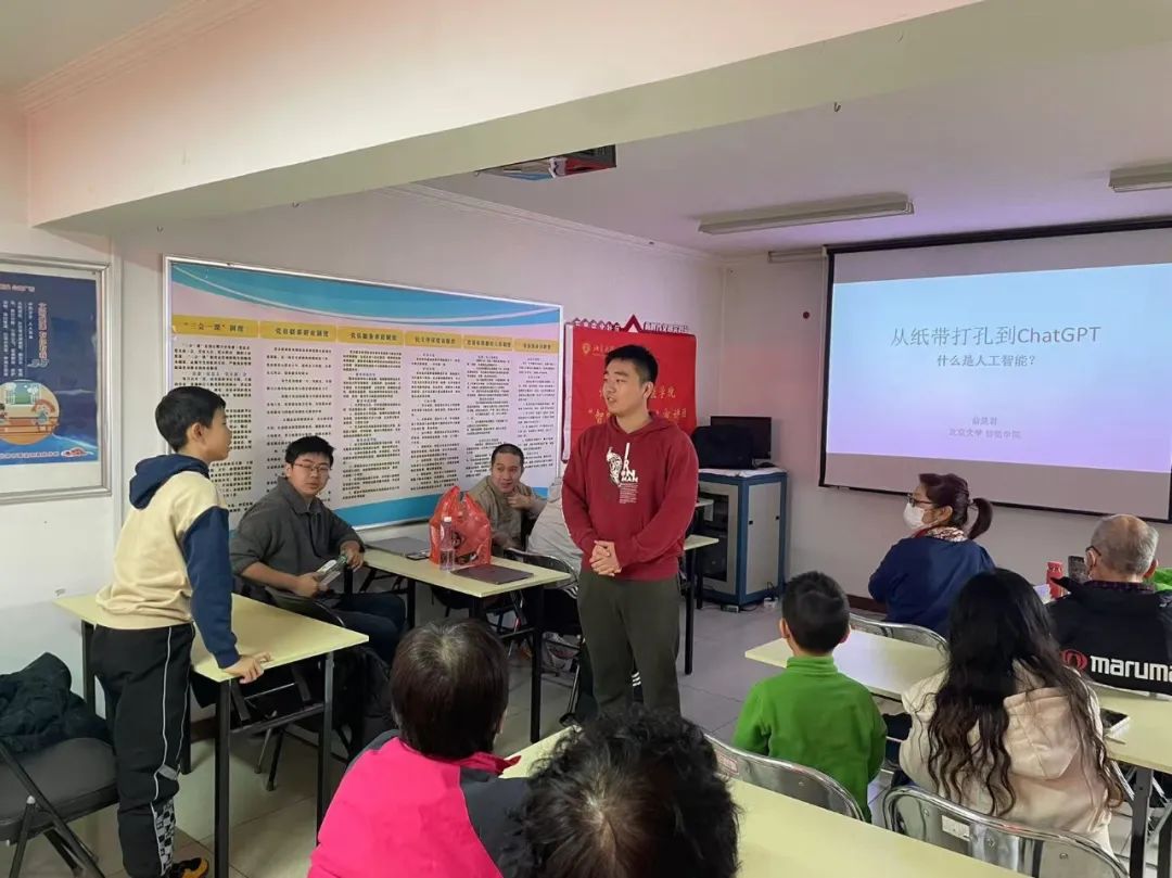 最后,俞昊君以“从纸带打孔到ChatGPT”为引,讲解了人工智能的基本理念与发展历程。通过浅显易懂的讲解,居民们了解了人工智能从最初只能完成简单任务到如今在某些领域已超越甚至媲美人类的过程。俞昊君还向小朋友们介绍了人工智能中的一些基本计算原理,并鼓励他们努力学习,未来在人工智能领域做出更大的创造,极大激发了孩子们对学习人工智能的兴趣。